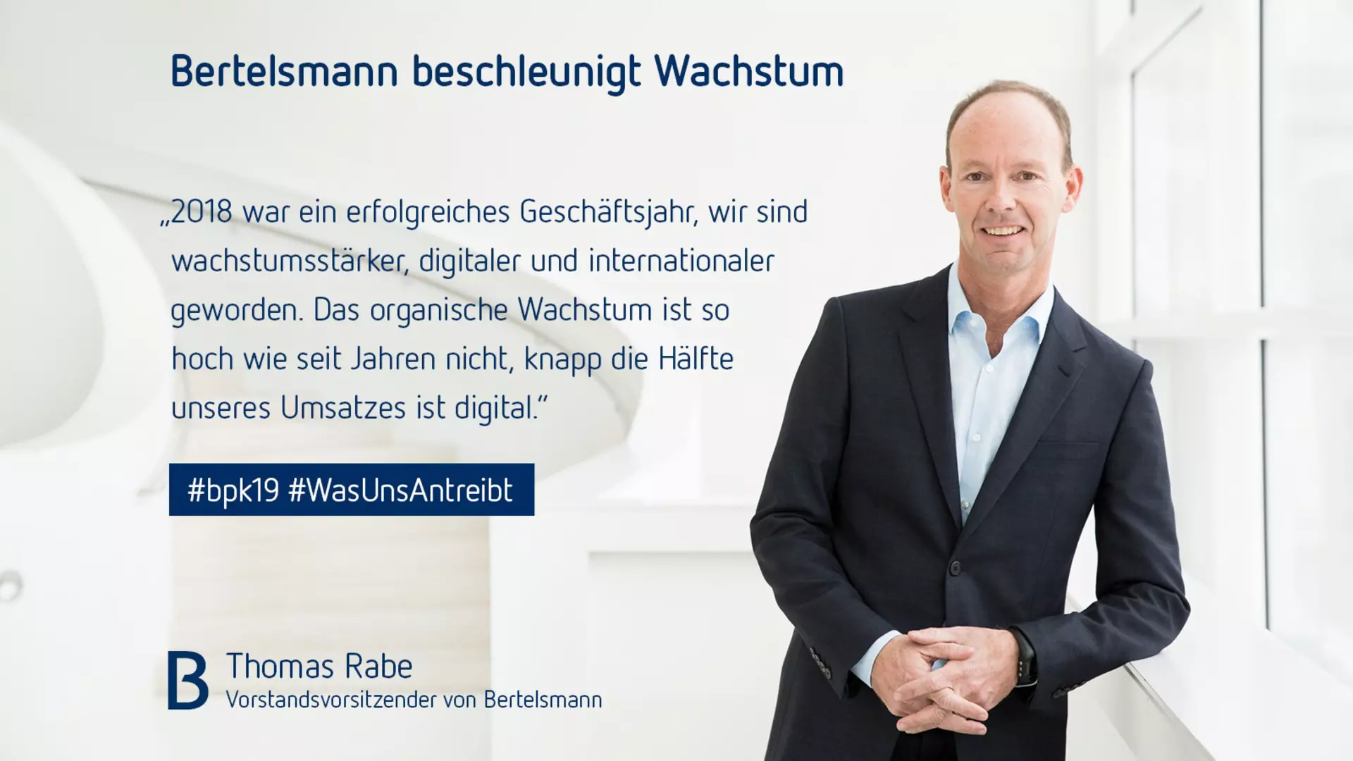 Thomas Rabe, Vorstandsvorsitzender von Bertelsmann, sagte: „2018 war ein erfolgreiches Geschäftsjahr für Bertelsmann, wir sind wachstumsstärker, digitaler und internationaler geworden. Das organische Wachstum ist so hoch wie seit Jahren nicht, knapp die Hälfte unseres Umsatzes stammt aus Digitalaktivitäten. Beides belegt, wie weit wir mit der Transformation des Konzerns inzwischen vorangekommen sind.“