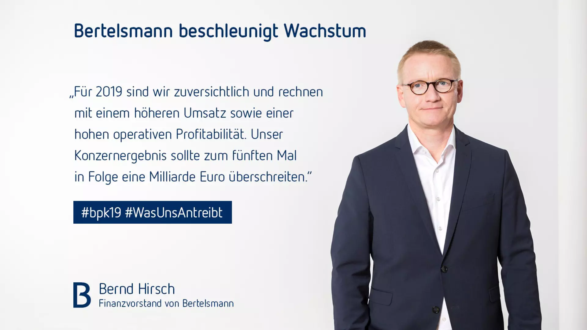 Bernd Hirsch, Finanzvorstand von Bertelsmann, sagte: „Bertelsmann verfügt über eine solide Finanzlage. Wir sind gut in das Jahr gestartet und haben unseren dynamischen Verschuldungsgrad, den sogenannten Leverage Factor, bereits in den ersten Monaten 2019 deutlich zurückgeführt. Für das Gesamtjahr sind wir zuversichtlich und rechnen mit einem höheren Umsatz sowie einer weiterhin hohen operativen Profitabilität. Unser Konzernergebnis sollte zum fünften Mal in Folge die Schwelle von einer Milliarde Euro überschreiten.“