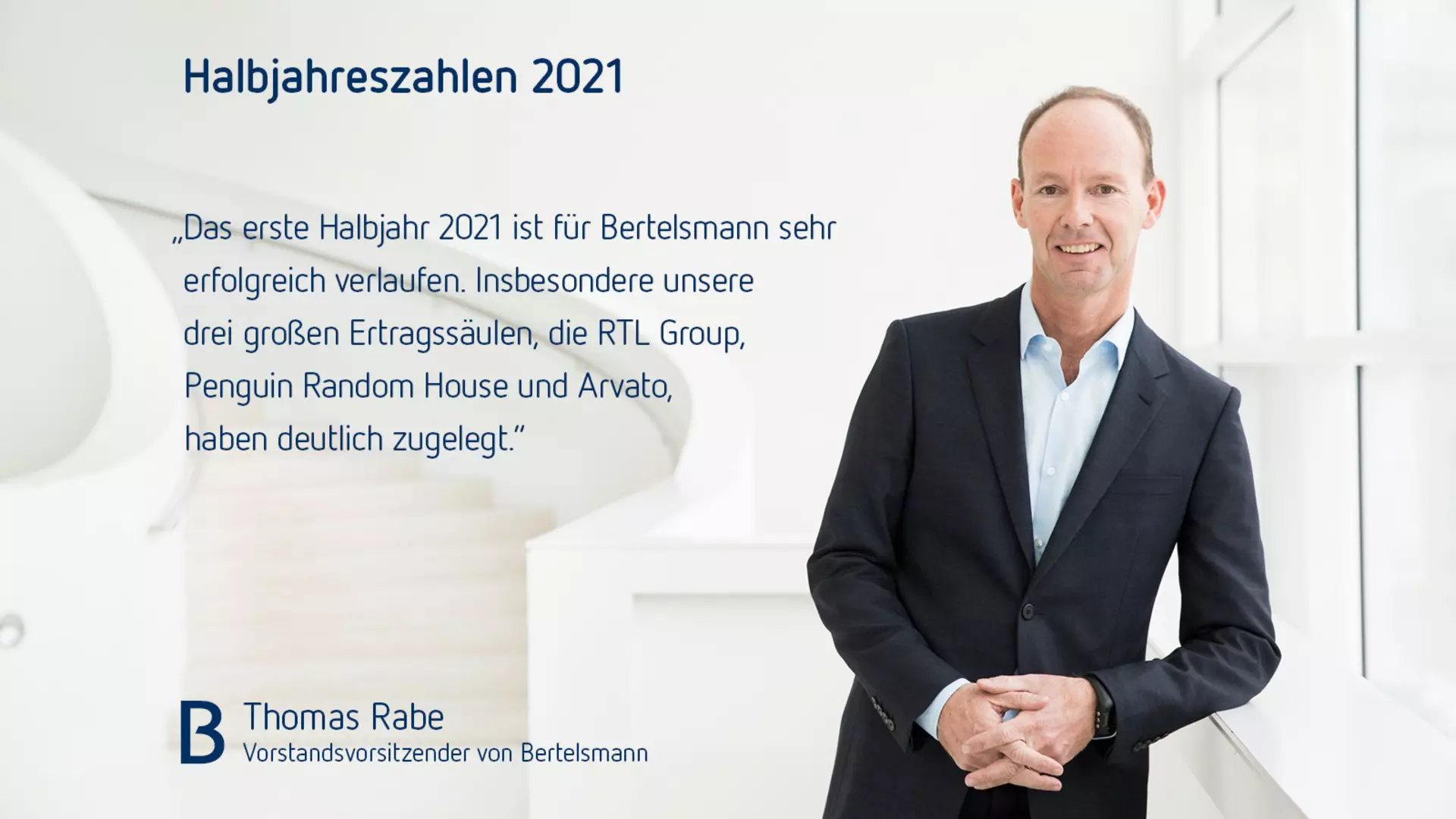 Thomas Rabe, Vorstandsvorsitzender von Bertelsmann, sagte: „Das erste Halbjahr 2021 ist für Bertelsmann sehr erfolgreich verlaufen. Insbesondere unsere drei großen Ertragssäulen, die RTL Group, Penguin Random House und Arvato, haben deutlich zugelegt. Das Portfolio von Bertelsmann Investments hat an Wert gewonnen und einen hohen Ergebnisbeitrag geleistet. Bei der Umsetzung unserer Strategie sind wir gut vorangekommen: Mit dem geplanten Zusammenschluss unserer französischen Fernsehtochter Groupe M6 mit Groupe TF1 und von RTL Nederland mit Talpa sowie mit der geplanten Zusammenführung von RTL Deutschland und Gruner + Jahr haben wir große Schritte bei der Schaffung nationaler Media-Champions gemacht. Bertelsmann ist maßgeblicher Treiber der Konsolidierung auf den europäischen Medienmärkten im Wettbewerb mit den globalen Tech-Plattformen.“