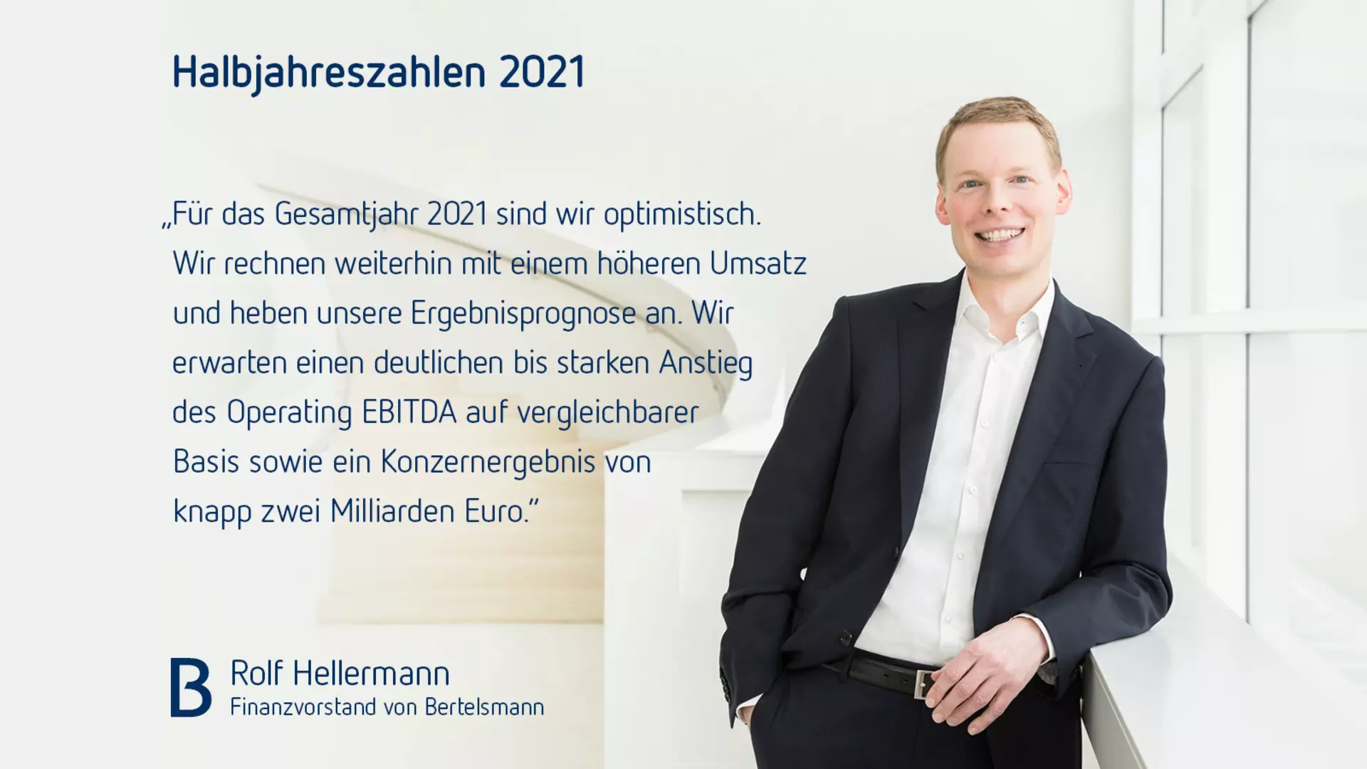 Rolf Hellermann, Finanzvorstand von Bertelsmann, sagte mit Blick auf die zweite Hälfte des Geschäftsjahres 2021: „Der sehr gute Geschäftsverlauf im ersten Halbjahr 2021 sowie unser diversifiziertes Geschäftsportfolio stärken unsere sehr solide finanzielle Position weiter. Entsprechend sind wir für das Gesamtjahr optimistisch. Wir rechnen weiterhin mit einem höheren Umsatz und heben unsere Ergebnisprognose an. Wir erwarten einen deutlichen bis starken Anstieg des Operating EBITDA auf vergleichbarer Basis sowie ein Konzernergebnis von knapp zwei Milliarden Euro.“