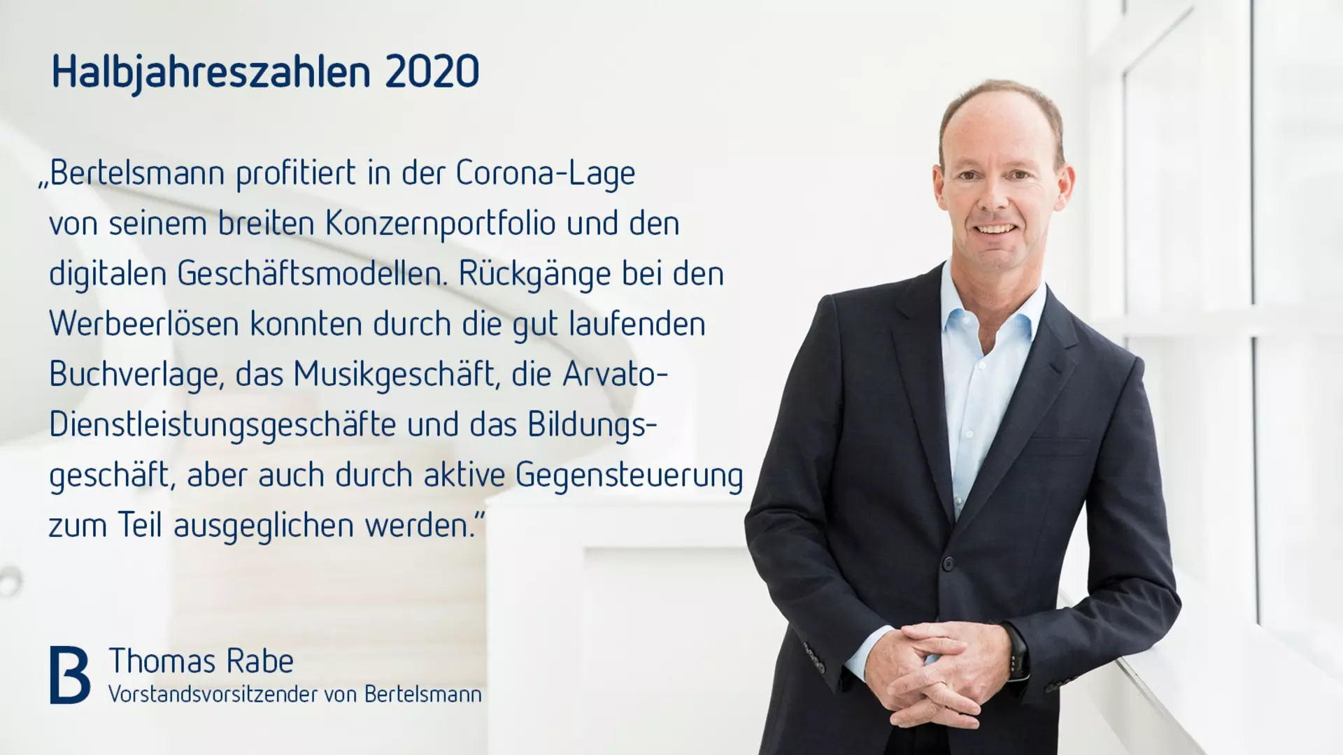 Thomas Rabe, Vorstandsvorsitzender von Bertelsmann, erklärte: „Das erste Halbjahr 2020 war geprägt durch die weltweite Corona-Pandemie. Wir sind gut in das Jahr gestartet, spüren jedoch seit März die wirtschaftlichen Auswirkungen der Pandemie – insbesondere auf den Werbemärkten. Bertelsmann profitiert in dieser Situation von seinem breiten Konzernportfolio und dem hohen Anteil digitaler Geschäftsmodelle. Die Rückgänge bei den Werbeerlösen konnten insbesondere durch die gut laufenden Buchverlage, das Musikgeschäft, die Arvato-Dienstleistungsgeschäfte und das Bildungsgeschäft, aber auch durch aktives Kosten- und Cashflow-Management zu einem beträchtlichen Teil ausgeglichen werden.“