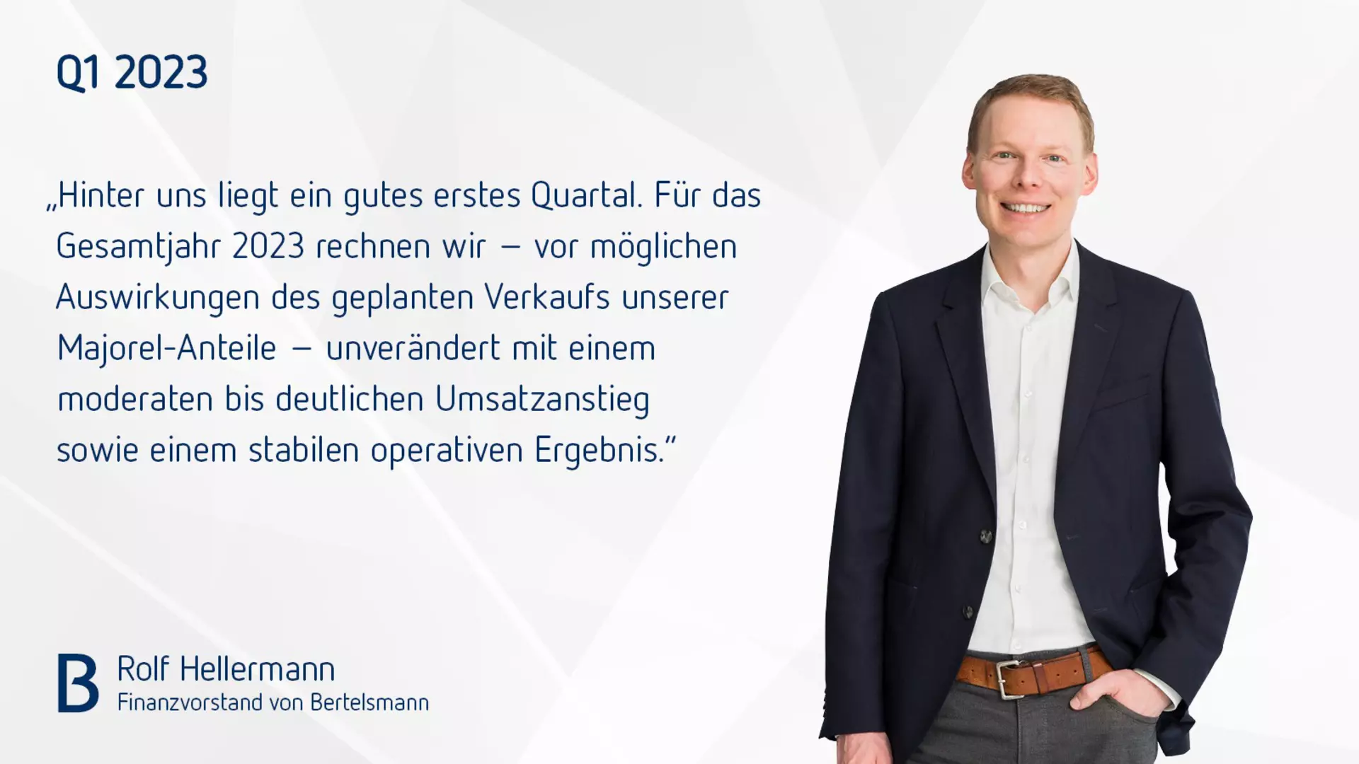 Rolf Hellermann, Finanzvorstand von Bertelsmann, sagt: „Hinter uns liegt ein gutes erstes Quartal. Für das Gesamtjahr 2023 rechnen wir – vor möglichen Auswirkungen des geplanten Verkaufs unserer Majorel-Anteile – unverändert mit einem moderaten bis deutlichen Umsatzanstieg sowie einem stabilen operativen Ergebnis.“