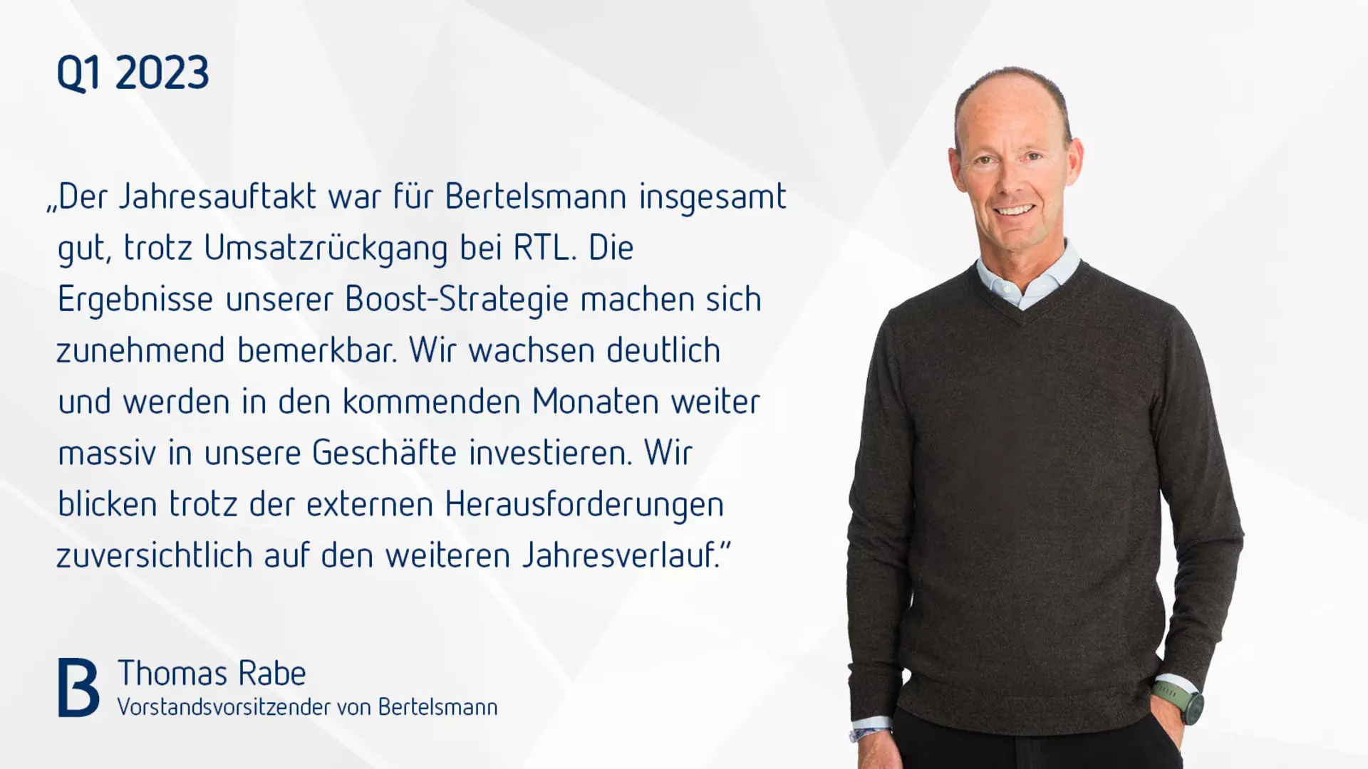 Thomas Rabe, Vorstandsvorsitzender von Bertelsmann, sagt: „Der Jahresauftakt war für Bertelsmann insgesamt gut, trotz Umsatzrückgang bei RTL. Die Ergebnisse unserer Boost-Strategie machen sich zunehmend bemerkbar. Wir wachsen deutlich und werden in den kommenden Monaten weiter massiv in unsere Geschäfte investieren. Wir blicken trotz der externen Herausforderungen zuversichtlich auf den weiteren Jahresverlauf.“