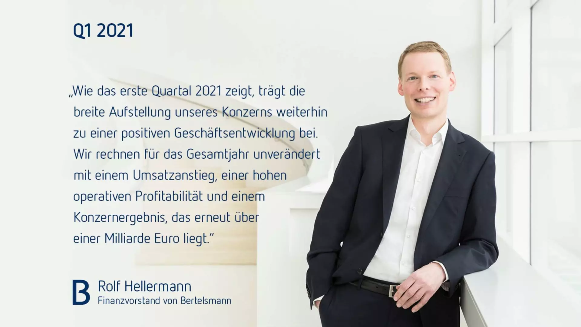 Rolf Hellermann, Finanzvorstand von Bertelsmann, sagte: „Aufgrund der weltwirtschaftlichen Auswirkungen der Corona-Pandemie sehen wir immer noch Unsicherheiten für das Geschäftsjahr 2021. Wie das erste Quartal 2021 zeigt, trägt die breite Aufstellung unseres Konzerns jedoch weiterhin zu einer positiven Geschäftsentwicklung bei. Wir rechnen vor diesem Hintergrund für das Gesamtjahr unverändert mit einem Umsatzanstieg, einer hohen operativen Profitabilität und einem Konzernergebnis, das erneut über einer Milliarde Euro liegt.“