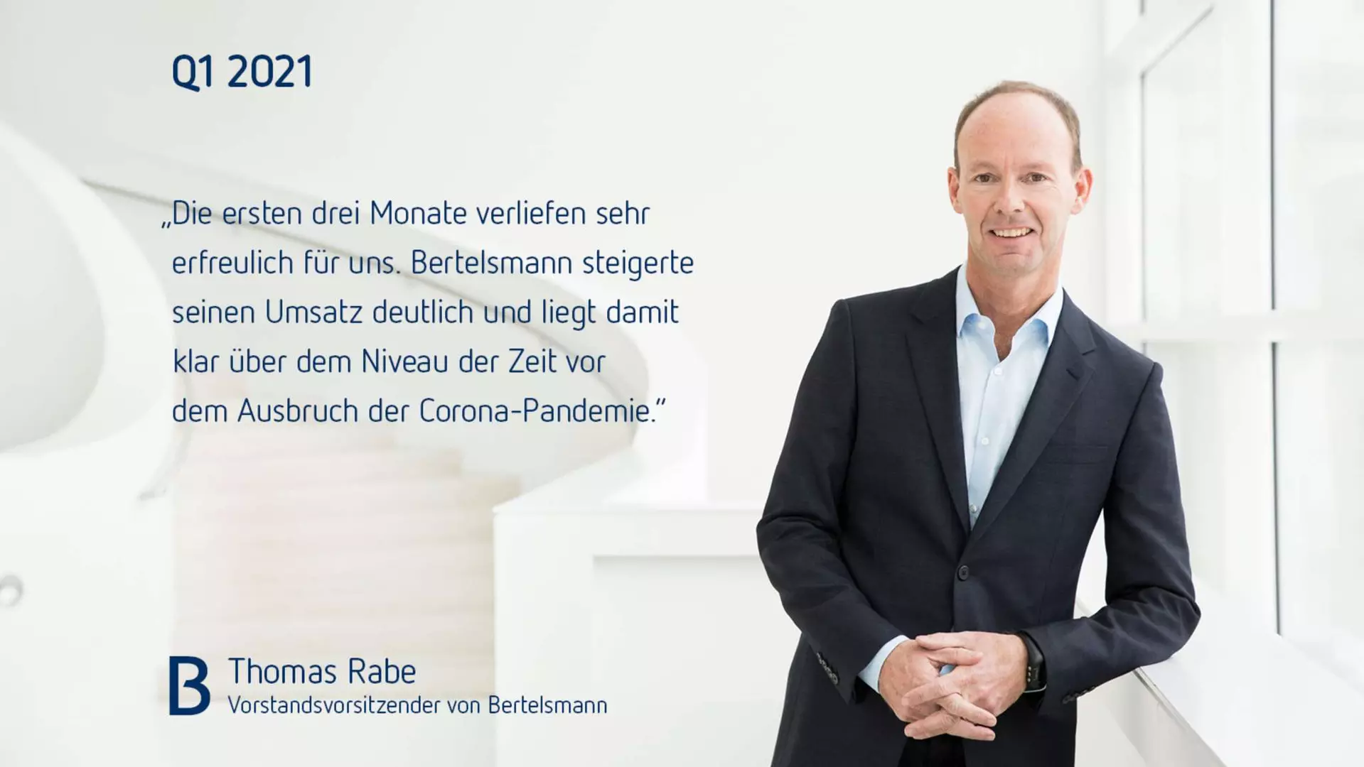 Thomas Rabe, Vorstandsvorsitzender von Bertelsmann, sagte: „Die ersten drei Monate verliefen sehr erfreulich für uns. Bertelsmann steigerte seinen Umsatz deutlich und liegt damit klar über dem Niveau der Zeit vor dem Ausbruch der Corona-Pandemie. Fast alle Unternehmensbereiche verzeichneten teils starkes organisches Wachstum. Zugleich haben wir Fortschritte in der Umsetzung unserer Strategie gemacht. Der Ausbau nationaler Media- Champions kam weiter voran, und auch unsere globalen Inhalte- und Dienstleistungsgeschäfte sind auf einem sehr guten Weg. Wir werden unsere Ziele für das Gesamtjahr erreichen.“