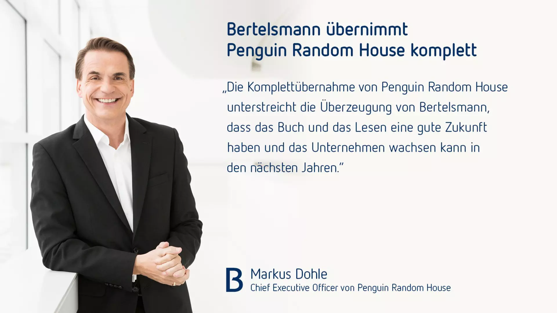 Markus Dohle, CEO von Penguin Random House und Vorstandsmitglied von Bertelsmann, betonte: „Die Komplettübernahme von Penguin Random House unterstreicht die Überzeugung von Bertelsmann, dass das Buch und das Lesen eine gute Zukunft haben und das Unternehmen wachsen kann in den nächsten Jahren. Wir sind sehr gut aufgestellt, um unsere Position global weiter organisch und akquisitorisch in bestehenden und neuen Märkten auszubauen. Ich persönlich freue mich sehr, die Kolleginnen und Kollegen und Autorinnen und Autoren der Verlagsgruppe Random House in Deutschland in unserer globalen Verlagsfamilie von Penguin Random House willkommen zu heißen. Die Zusammenführung durch Bertelsmann wird unsere gemeinsamen Stärken noch besser zur Geltung bringen.“