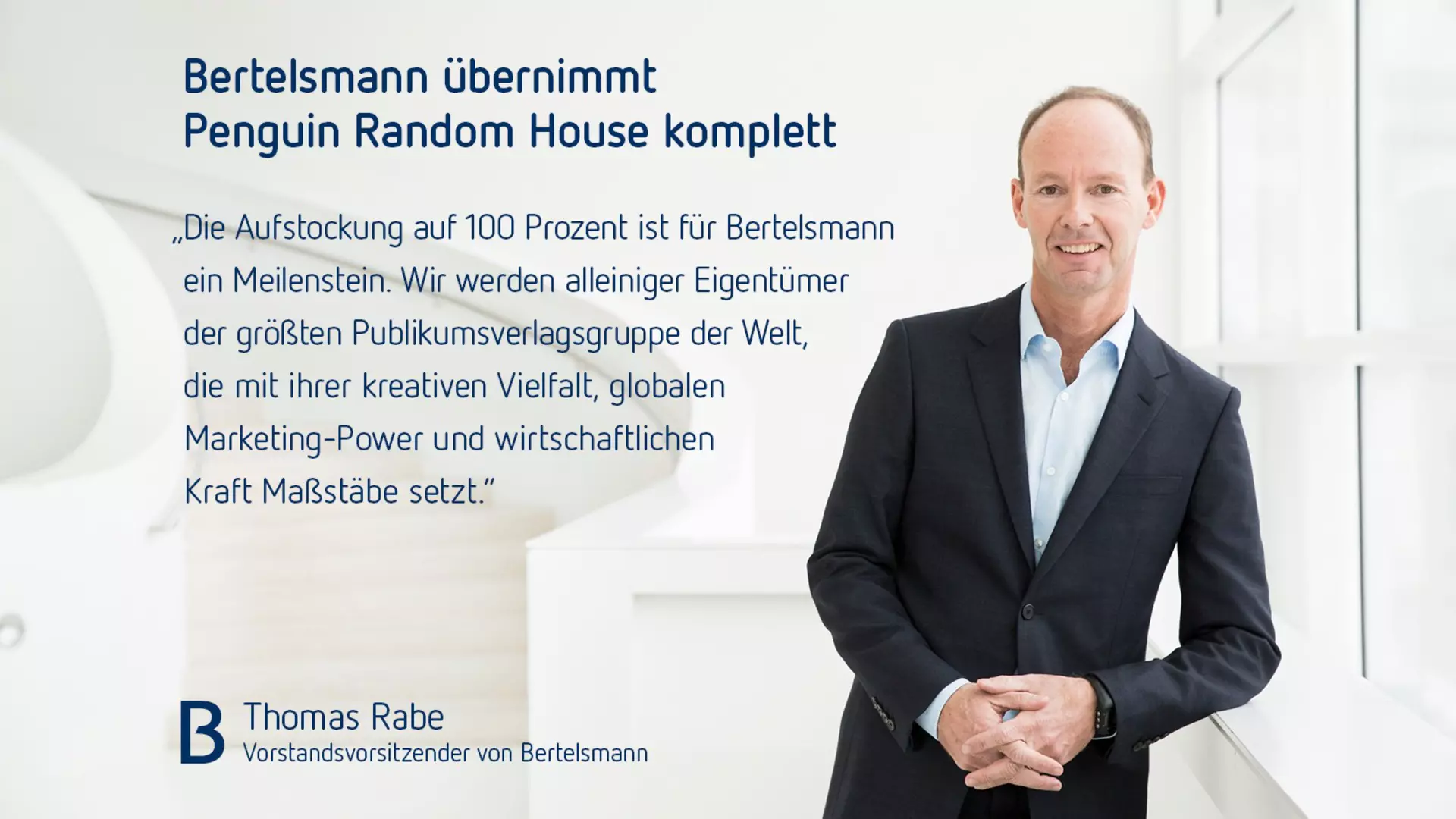 Thomas Rabe, Vorstandsvorsitzender von Bertelsmann und Vorsitzender des Verwaltungsrates von Penguin Random House, sagte: „Die Aufstockung auf 100 Prozent ist für Bertelsmann ein Meilenstein. Wir werden alleiniger Eigentümer der größten Publikumsverlagsgruppe der Welt, die mit ihrer kreativen Vielfalt, globalen Marketing-Power und wirtschaftlichen Kraft Maßstäbe setzt. Wir werden Penguin Random House in den nächsten Jahren weiter ausbauen, durch organisches Wachstum und Akquisitionen. Das Buchgeschäft gehört zur Identität von Bertelsmann. Für uns und unsere Aktionäre ist die Transaktion wirtschaftlich attraktiv, da sich der Anteil der Bertelsmann-Aktionäre am Konzernergebnis um mehr als 70 Millionen Euro jährlich erhöhen wird.“