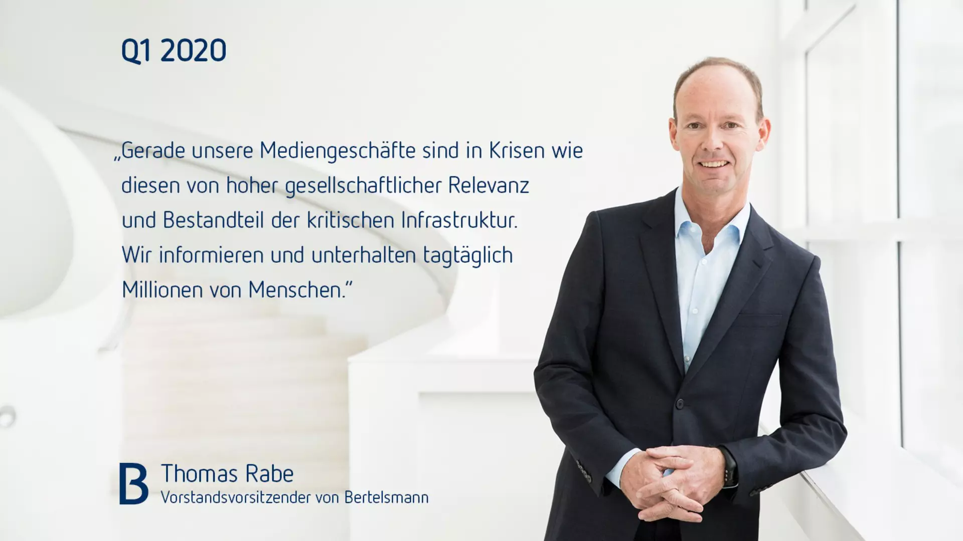 Thomas Rabe, Vorstandsvorsitzender von Bertelsmann, sagte: „Das Geschäftsjahr 2020 wird mit den wirtschaftlichen Folgen der Corona-Pandemie eine Herausforderung. Wir sind gut ins Jahr gestartet, spüren jedoch seit März zunehmende Auswirkungen auf unsere Geschäfte. Wir haben frühzeitig eine Reihe von Maßnahmen zum Schutz der Gesundheit unserer Mitarbeiter und zur Sicherung unserer Geschäfte getroffen. Das breite Geschäftsportfolio von Bertelsmann wirkt dabei ebenso positiv wie der hohe Anteil digitaler Geschäfte, die im vergangenen Geschäftsjahr erstmals mehr als 50 Prozent vom Gesamtumsatz ausmachten. Gerade unsere Mediengeschäfte sind in Krisen wie diesen von hoher gesellschaftlicher Relevanz und Bestandteil der kritischen Infrastruktur. Wir informieren und unterhalten tagtäglich Millionen von Menschen.“