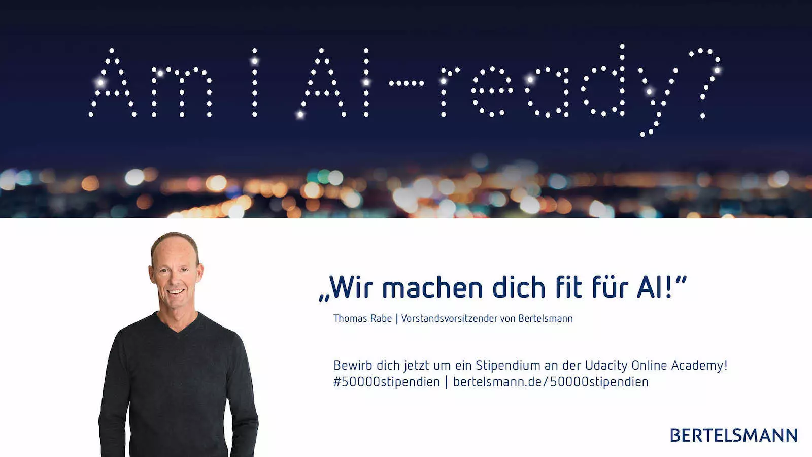 - Bertelsmann-CEO Thomas Rabe als Botschafter in TV-Spots, Print- und Online-Anzeigen, Social Media Ads und auf Landing-Page für „AI. And I can do more.“