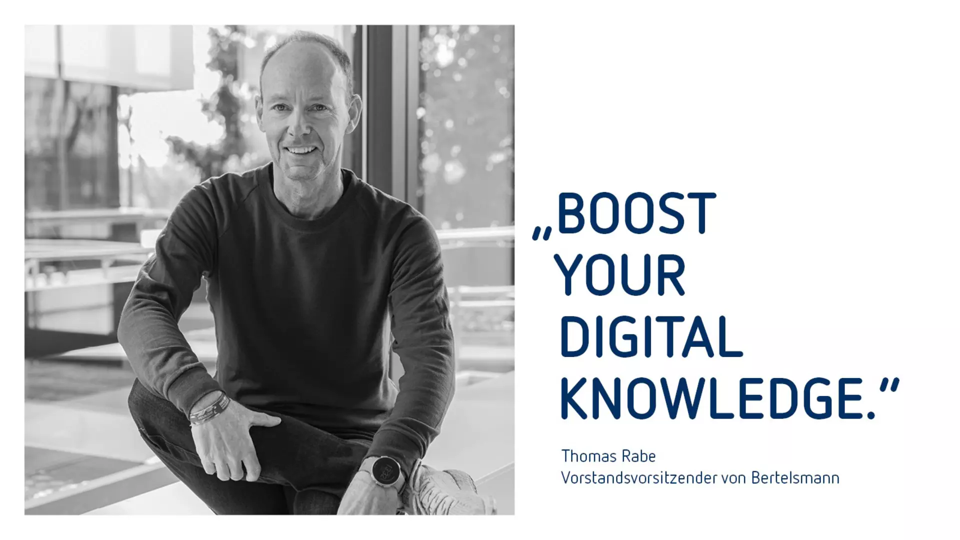 Die Spots der neuen Medienkampagne zeigen in schneller Abfolge Menschen an verschiedenen Orten der Welt, die digitale Geräte nutzen und dabei Datenmanagement, Cloud Computing und Künstliche Intelligenz erleben. Die Botschaft: herausfinden, was die Möglichkeiten der digitalen Zukunft sind und selbst Teil des technologischen Fortschritts werden. Auf eine kurze Formel bringt das Bertelsmann-CEO Thomas Rabe, der in Print- und Onlineanzeigen appelliert: „Boost your digital knowledge.“