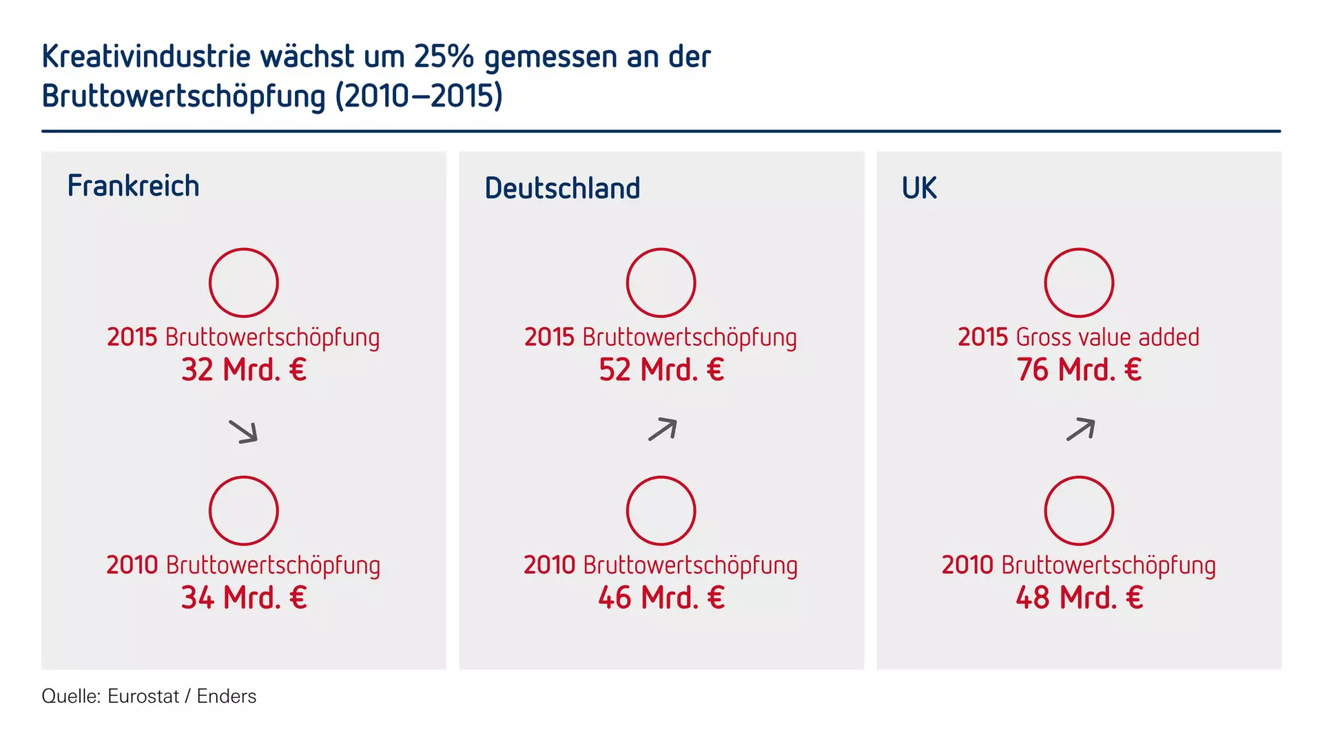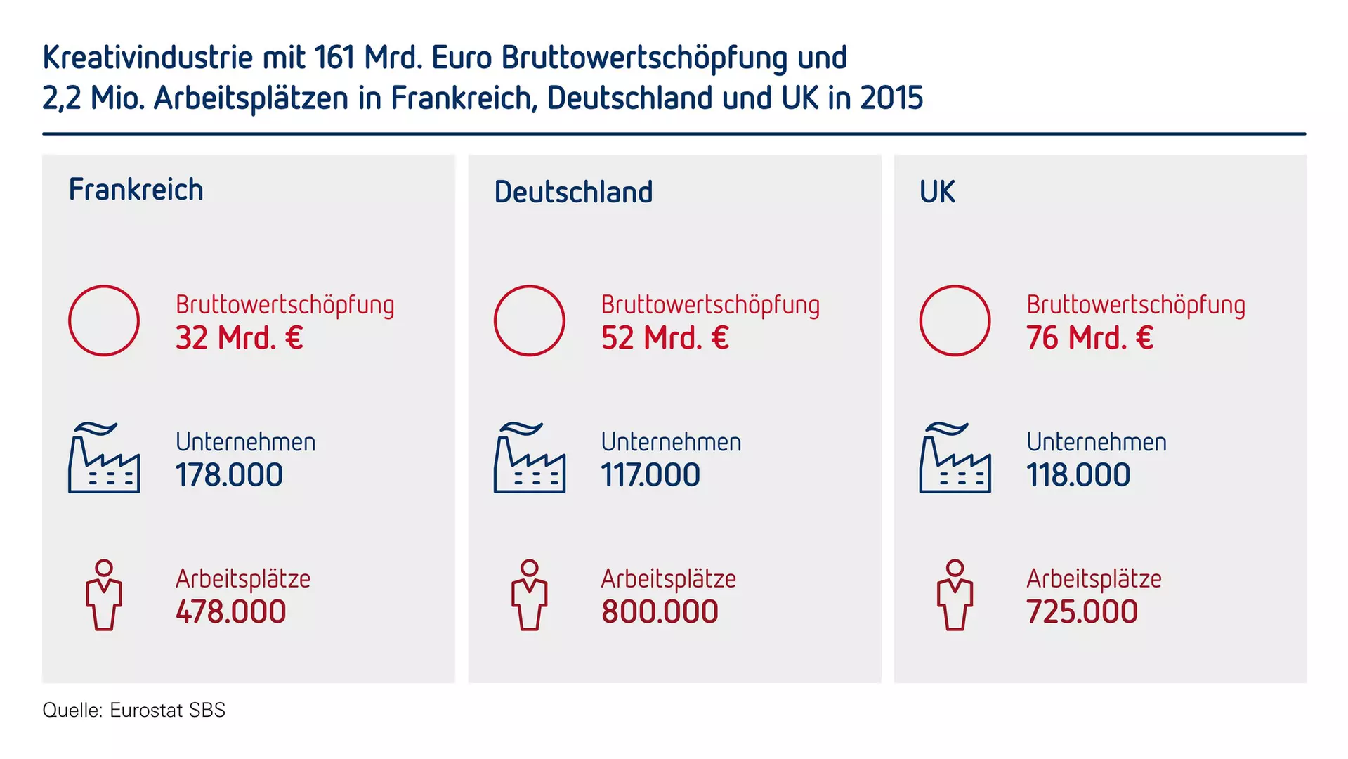 Großbritannien war 2015 mit einer Bruttowertschöpfung von 76 Milliarden Euro das führende Kreativzentrum in Europa. Insgesamt beschäftigten rund 118.000 britische Arbeitgeber 725.000 Mitarbeiter. Hinzu kommen eine große Anzahl von Freiberuflern. Die deutsche Kreativwirtschaft erwirtschaftete durch die Aktivitäten von 157.000 Unternehmen mit 947.000 Beschäftigten 52 Milliarden Euro an der Bruttowertschöpfung. Frankreichs Kreativwirtschaft erzielte eine Bruttowertschöpfung von 32 Milliarden Euro, die von 178.000 Unternehmen mit 478.000 Beschäftigten erwirtschaftet wurde. Die britische Kreativindustrie entwickelte sich im Betrachtungszeitraum von 2010 bis 2015 am stärksten. Die Entwicklung der Kreativbranche in Frankreich und Deutschland ist über die Jahre hinweg stabil bzw. leicht positiv.