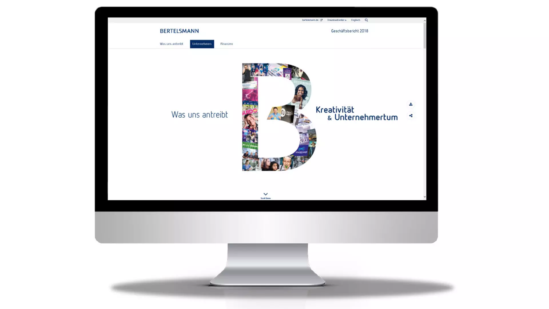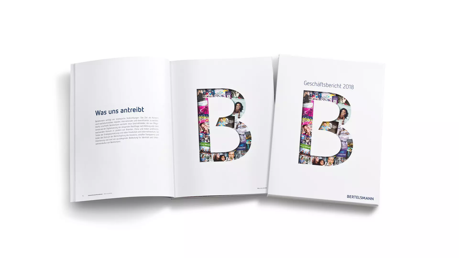 Das diesjährige Motto des Geschäftsberichts wird durch farbenfrohe Collagen illustriert, die sich aus kreativen und unternehmerischen Highlights aus dem Geschäftsjahr 2018 zusammensetzen. Der für alle Endgeräte geeignete Online-Geschäftsbericht greift die Kernbotschaften und Gestaltung der Print-Ausgabe auf. Aufwändige Animationen veranschaulichen die Vielfalt und Reichweite des Kreativangebots sowie die unternehmerischen Erfolge von Bertelsmann.