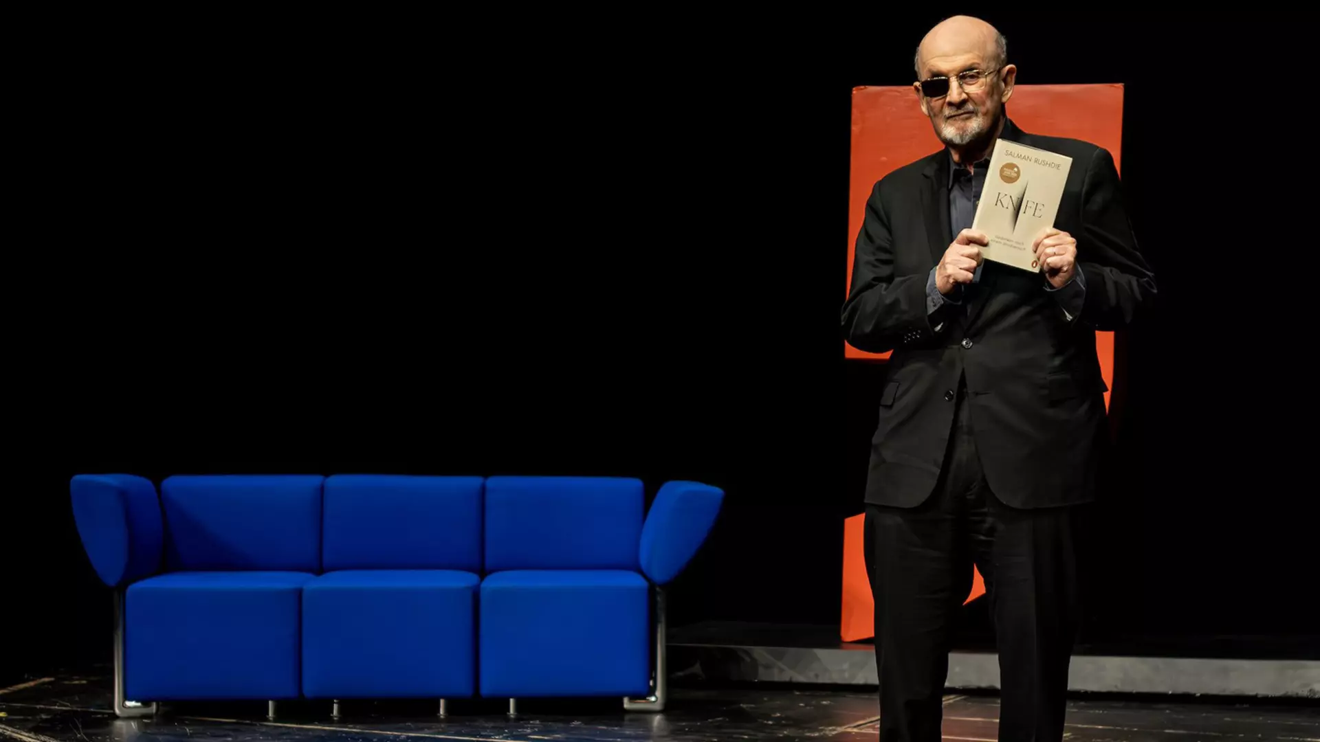 Born in India, raised in England, and living in New York since 2000, Salman Rushdie is one of the best-known writers of our time – in part because of his unusual and award-winning works, which have been translated into more than 40 languages. But he also owes his long-standing fame to his book “The Satanic Verses” and the subsequent death sentence, a “fatwa,” issued by Iran’s then revolutionary leader Ayatollah Khomeini in 1989 for allegedly insulting the Prophet Mohammed – and to a near-fatal knife attack on him in the summer of 2022. Rushdie narrowly survived and will turn 77 next month, on June 19. The fact that he is currently on an international reading tour for his new book is also a miracle from his personal point of view. But Rushdie would not be Rushdie if, even after this attack, he had not maintained his determination to pursue his profession, to write stories about people, to share with the world his thoughts about the world in general and, in this case, about his own fate in particular. In “Knife: Meditations After an Attempted Murder,” published worldwide in various languages by Penguin Random House and in Germany by Penguin, he describes the traumatic events of the attack and its aftermath for the first time and in striking detail. Yesterday, he presented the book to some 600 guests at the Deutsches Theater in Berlin, in conversation with literary agents Marie Kaiser and Thomas Böhm. The event, which was organized by Bertelsmann and its literary format “The Blue Sofa” in cooperation with the Berlin International Literature Festival, the Deutsches Theater Berlin and the German Publishers & Booksellers Association, was the only public event to mark the publication of the book in Germany. It was broadcast live on RBB’s Radioeins and Radio 3. The well-known actor Ulrich Matthes, a member of the Deutsches Theater ensemble, read passages from the book with moving intonation. Also present were Rushdie’s wife, Rachel Eliza Griffiths, who is also an author, and Rushdie’s long-time German translator, Bernhard Robben.