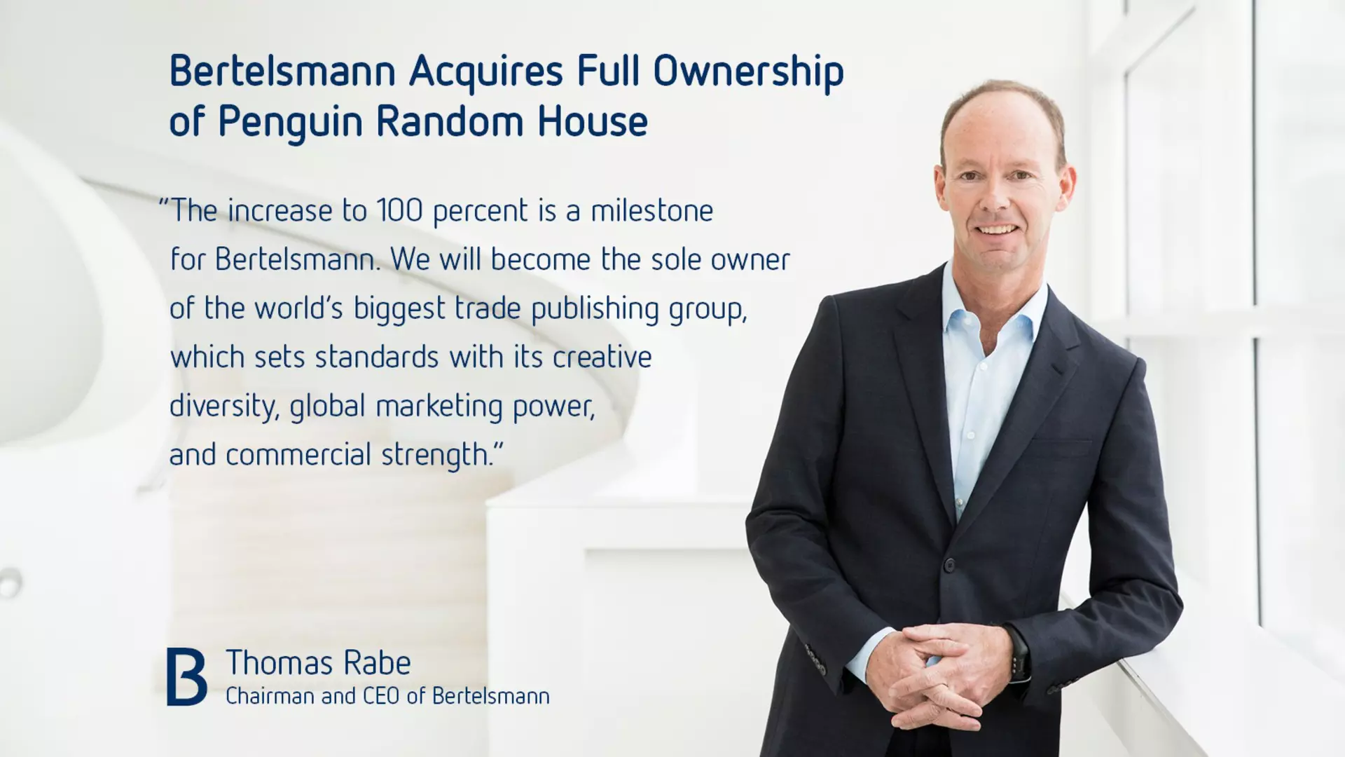 Thomas Rabe, Chairman and CEO of Bertelsmann and Chairman of the Board of Directors at Penguin Random House, said: “The increase to 100 percent is a milestone for Bertelsmann. We will become the sole owner of the world’s biggest trade publishing group, which sets standards with its creative diversity, global marketing power, and commercial strength. We will continue to expand Penguin Random House in the coming years, through organic growth and acquisitions. The book business is part of Bertelsmann's identity. For us and our shareholders, the transaction is commercially attractive, as the share of Bertelsmann’s shareholders in group profit will increase by more than €70 million per year.”