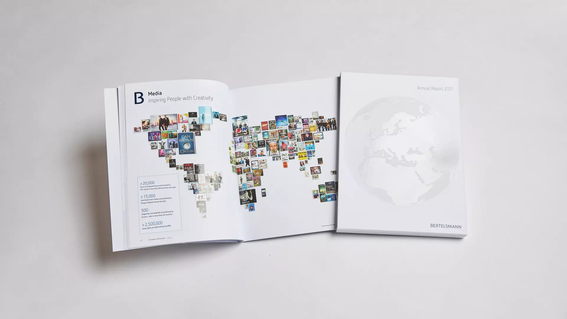 With its annual report under the heading “Our global success story of entrepreneurship and creativity,” the Group underscores its international orientation and highlights exemplary successful businesses in its eight divisions. This year’s motto is illustrated by four individual world maps showcasing the Group’s creative, service and education offerings as well as its strategic investments. Each of the maps represents one of Bertelsmann’s pillars: Media, Services, Education and Investments.