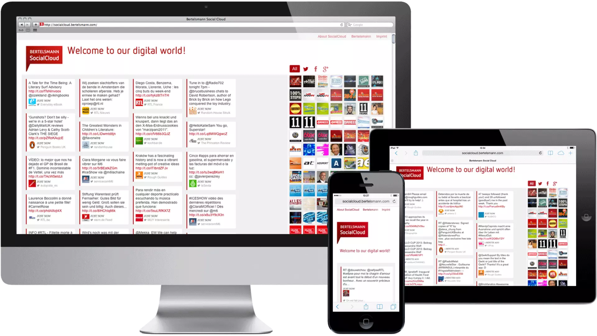It has become commonplace for companies to seek contact with their customers and the public on platforms like Facebook and Twitter. Now the international media and services company Bertelsmann has gone one step further, by combining and displaying all of its official social media channels on a single website. Though its focus is initially on Facebook, Twitter and Google+, the site already pools news and posts from over 2,000 social media channels around the world – and the number is growing.