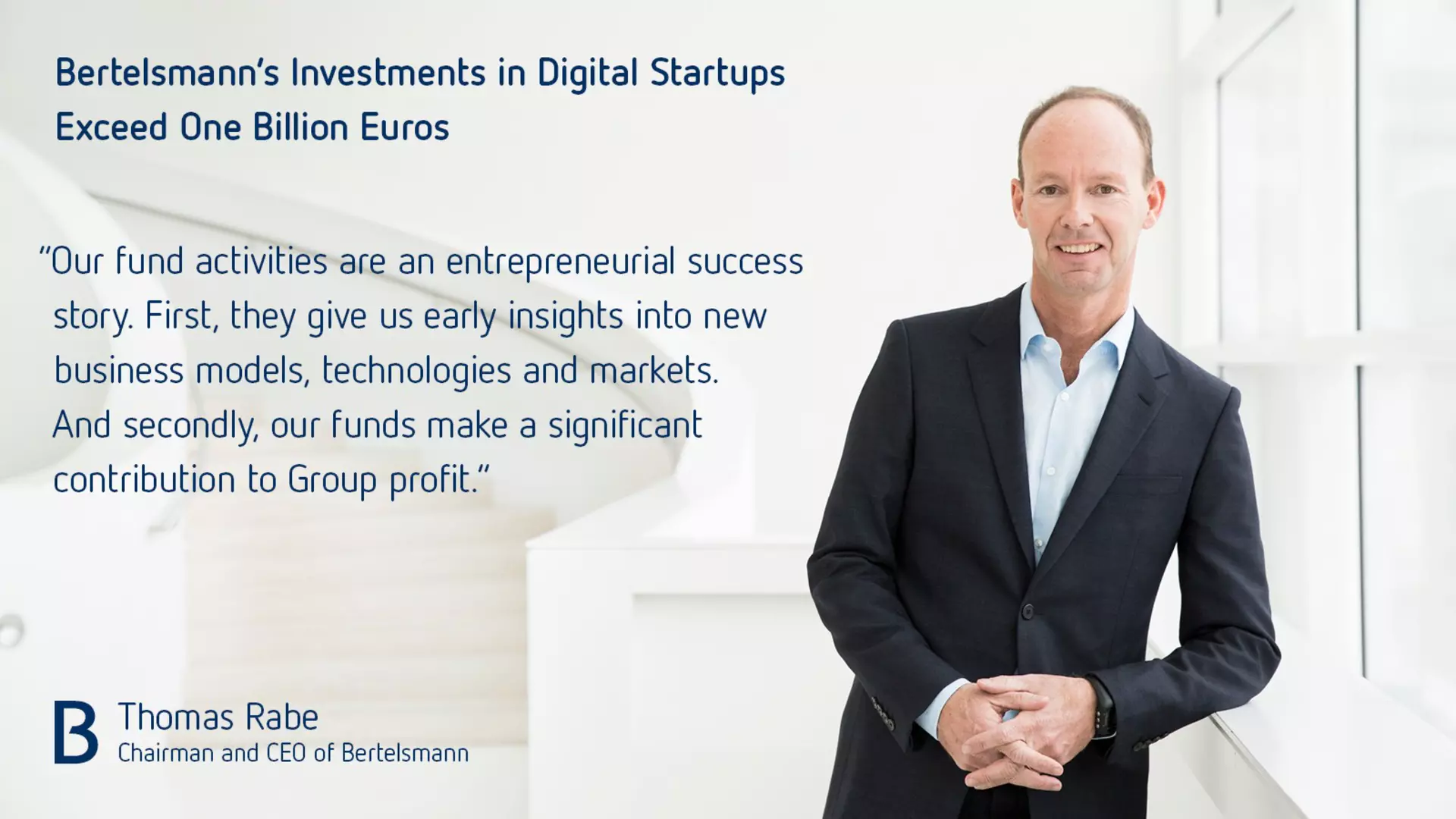 Since the launch of the first fund, BDMI, in 2006, Bertelsmann has invested around one billion euros in young digital companies with innovative business models via its corporate funds. The financial returns, especially from disposals, amounted to more than €600million in the same period.