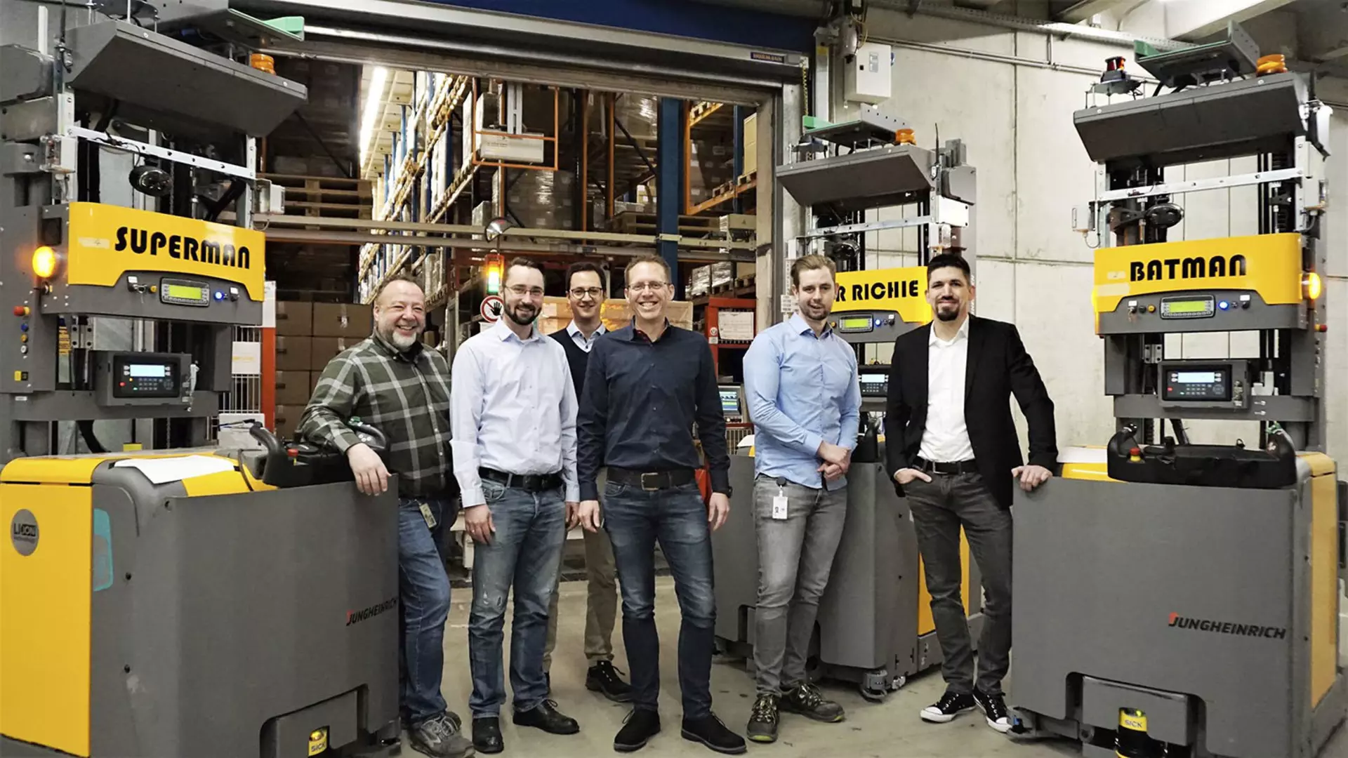 Among other things, Arvato uses its Harsewinkel location to deliver logistics services for customers in the pharmaceutical and medical technology industries, with 31,000 square meters available for this purpose at the site. To cope with the increasing volume of internal pallet transport tasks while also countering the shortage of skilled labor, the site has invested in six driverless transport trucks developed by the specialist Jungheinrich. For this purpose, around 300 reflectors were installed on the walls and shelves along the transport routes in the summer of 2019. These serve as navigation points for the vehicles and are recognized by a laser scanner on the vehicles. This enables the driverless transport vehicle (DTV) to navigate with an accuracy of up to two millimeters using triangulation.During the implementation phase, a new conveyor technology control system was installed, floor markings were applied in accordance with 5S standards, and turning stations and buffer racks were set up on the central travel track to automatically buffer pallets and map out longitudinal and transverse transport operations. The new technology is rounded off by system interfaces with the warehouse management software and the conveyor technology control system, plus new DTS-specific scanning dialogs. Employees working in Goods Receipt, Outgoing Goods, and Internal Transport were informed about the concept and the corresponding rules of conduct at the beginning of the year. The six vehicles, named after famous superheroes, drive to all the site’s warehouses, Goods Receipt and Outgoing Goods, and also stop at the disposal area to empty the waste containers.