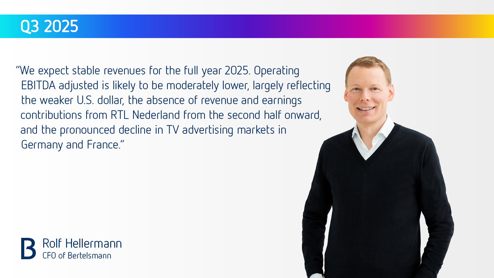 Bertelsmann CFO Rolf Hellermann said: “We expect stable revenues for the full year 2025. Operating EBITDA adjusted is likely to be moderately lower, largely reflecting the weaker U.S. dollar, the absence of revenue and earnings contributions from RTL Nederland from the second half onward, and the pronounced decline in TV advertising markets in Germany and France.”